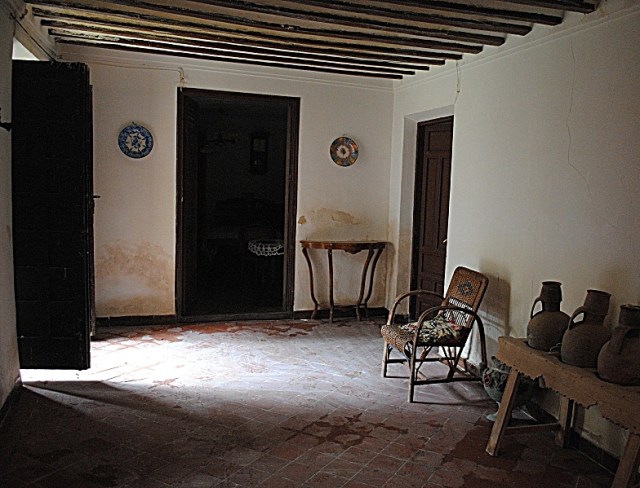 Un zaguán con una puerta al fondo,